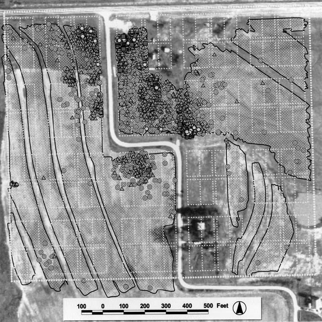 | | Figure 5. A distribution of domestic artifacts. The squares are doll parts, the hexagons are buttons, the triangles are curved glass, and the circles are ceramics. (Courtesy, HistArc Consultants, LLC). |